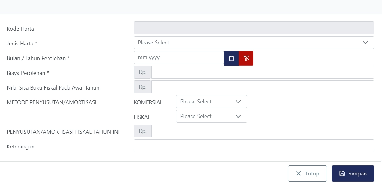 Tahun perolehan aset. Isi dengan format YYYY, contohnya 2025 bukan 25’. |