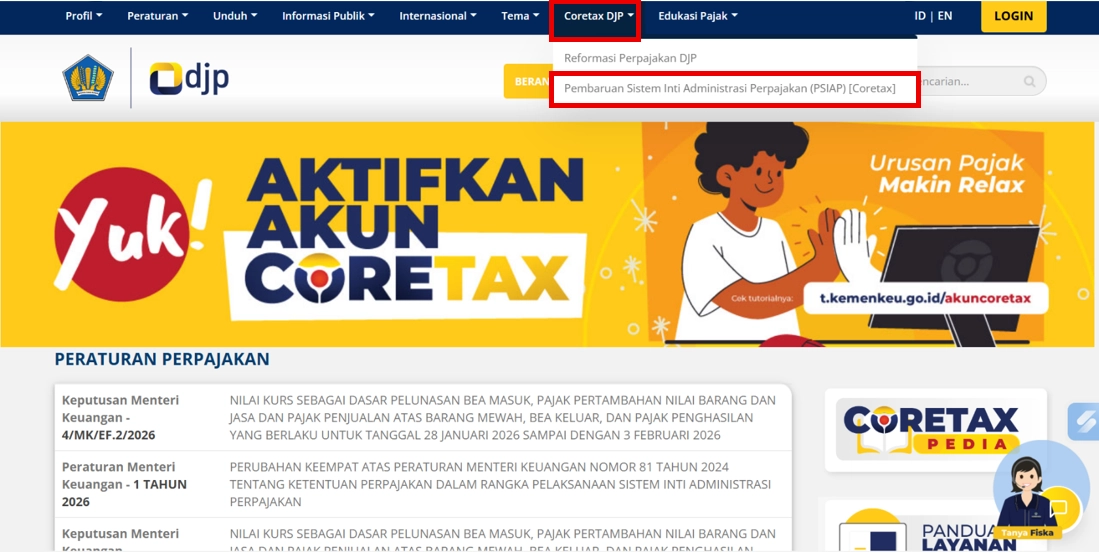 Buka website pajak.go.id, pilih menu Coretax DJP, lalu klik bagian Pembaruan Sistem Inti Administrasi Perpajakan (PSIAP).