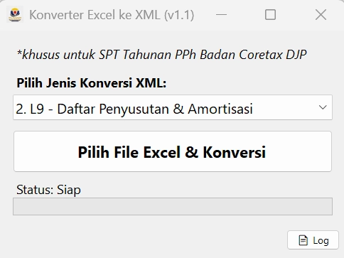 Tampilan yang muncul akan seperti di bawah ini. Jenis file yang ingin Anda convert yaitu L9 - Daftar Penyusutan & Amortisasi. Klik Pilih File Excel & Konversi, lalu pilih file Excel hasil pekerjaan Anda tadi.