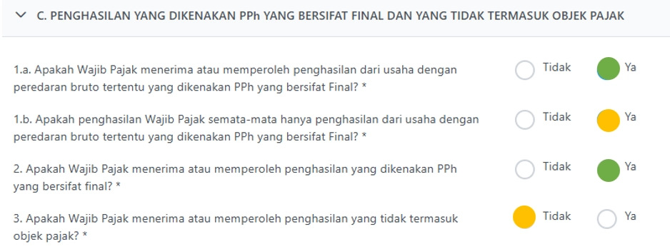 Kalau UMKM Badan Anda menerima penghasilan dari Indonesia yang sudah dipotong pajak, jawab Ya. Begitu juga kalau ada penghasilan luar negeri. Tapi di artikel ini, asumsinya penghasilan UMKM Badan dari Indonesia semua ya.