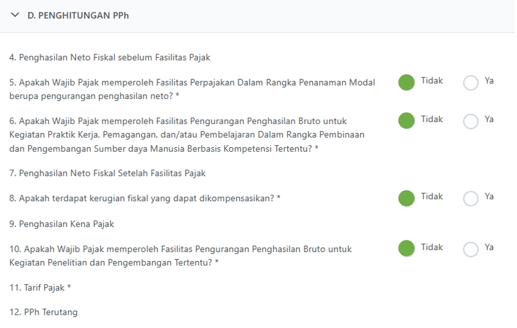 Sedangkan untuk fasilitas pengurangan PPh Badan jarang diberikan, jadi Anda bisa jawab Tidak.